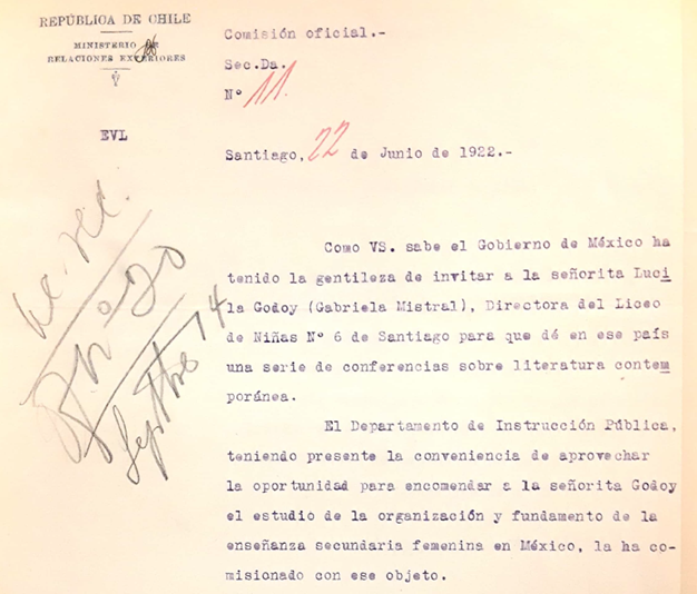 Documento oficial que detalla las labores de Gabriela Mistral en México