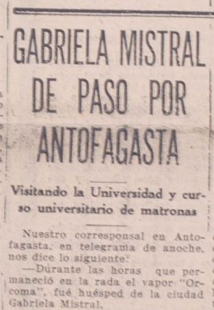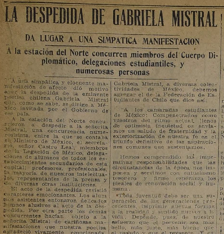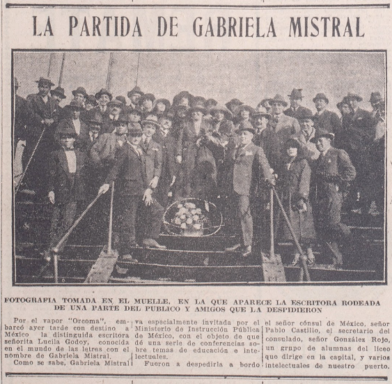 Nota de prensa con fotografía sobre la partida de Gabriela Mistral a México.