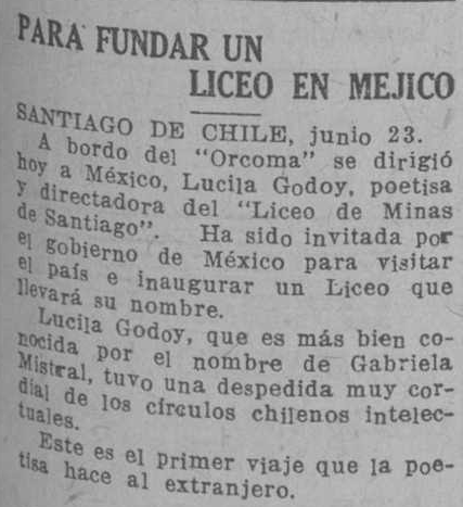 Nota de prensa sobre Gabriela Mistral y el propósito de fundar un liceo en México.